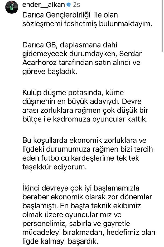 Darıca Gençlerbirliği Spor Kulübünün en başarısız antrenörleri arasında yer alan Ender Alkan kulüpten ayrıldığını açıkladı. Aldığı başarısız sonuçlarla 3. Ligden son anda kurtulan Darıca Gençlerbirliği’nde taraftarlarında büyük tepkisini çeken Ender Alkan yayınladığı mesajla kulüple olan sözleşmesini fesih ettiğini açıkladı. Yaptığı veda açıklamasına kulübün eski başkanı Arif Gülen’den tepki geldi. Gülen yaptığı zehir zemberek açıklamasında Ender Alkan’ı özür dilemeye davet etti. Gülen şu görüşlere yer verdi;