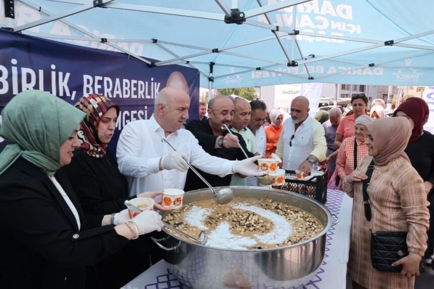 Birlik beraberlik ve paylaşmanın sembolü olan Muharrem ayının en güzel örneği huzur şehri Darıca’da yaşanıyor. Darıca Belediyesi, Osmangazi Mahallesi’nde kurulan Salı pazarı girişinde kurulan stantta vatandaşlara aşure dağıttı. Saat Kulesi önünde gerçekleşen etkinlikte Belediye Başkanı Muzaffer Bıyık ve eşi Havva Bıyık, AK Parti Kadın Kolları Başkanı Selma Gülenç ve Osmangazi Mahalle Muhtarı Kenan Demirbaş, vatandaşlara aşure ikramında bulundu. Meclis üyeleri ve birim müdürlerinin eşlik ettiği aşure ikramında Başkan Muzaffer Bıyık, vatandaşlarla sohbet ederek birlik beraberlik mesajları verdi.