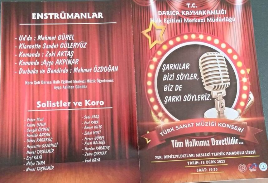 Darıca Halk Eğitim Merkezi Türk Sanat Müziği Korosu ‘’Şarkılar Bizi Söyler Biz de Şarkı Söyleriz’’ programında Darıcalılara müzik ziyafeti çekecek.  18 Ocak Çarşamba günü saat 19:30’da Deniz Yıldızları Mesleki Teknik Anadolu Lisesi’nde  gerçekleştirilecek konsere tüm sanat müziği seven Darıcalılar davet edildi. Birbirinden seçkin Türk Sanat Müziği parçalarının seslendirileceği konserde koro şefliğini Müzik Öğretmeni  Şef Ayça Aslıhan Gündüz yapacak. Halk Eğitim Merkezi Müdürü Süleyman Özdağ İlçe Kaymakamı Yüksel Kara’yı makamında ziyaret ederek konsere davet etti.