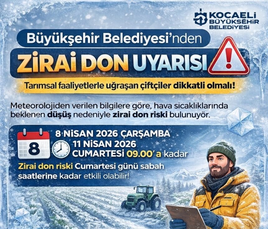 Açıklamada, söz konusu riskin 8 Nisan Çarşamba (yarın) günü saat 00.00 itibarıyla başlayacağı ve 11 Nisan Cumartesi günü saat 09.00’a kadar etkili olmasının beklendiği ifade edildi. Kocaeli Büyükşehir Belediyesi ayrıca, il genelindeki çiftçilere zirai don riskine karşı bilgilendirme amacıyla SMS gönderdi.
