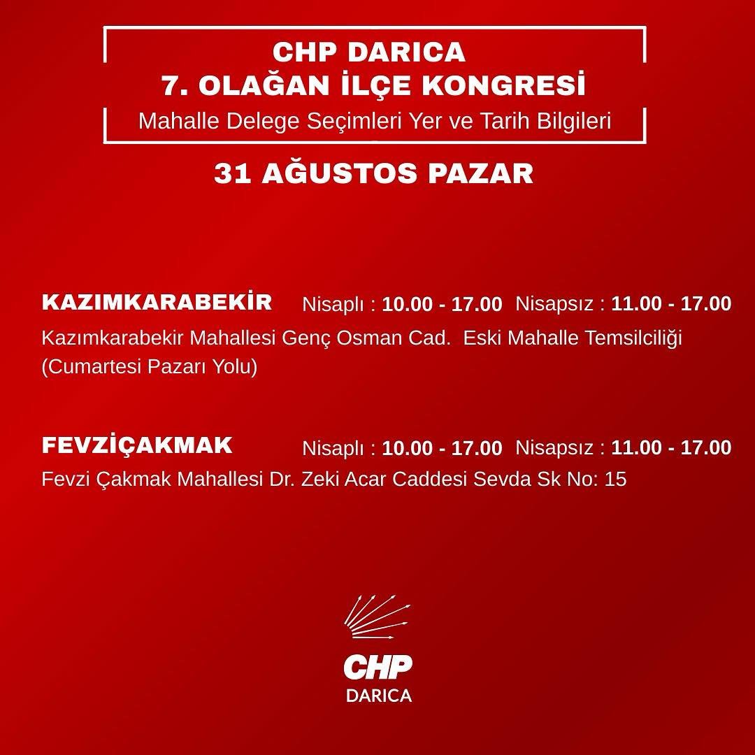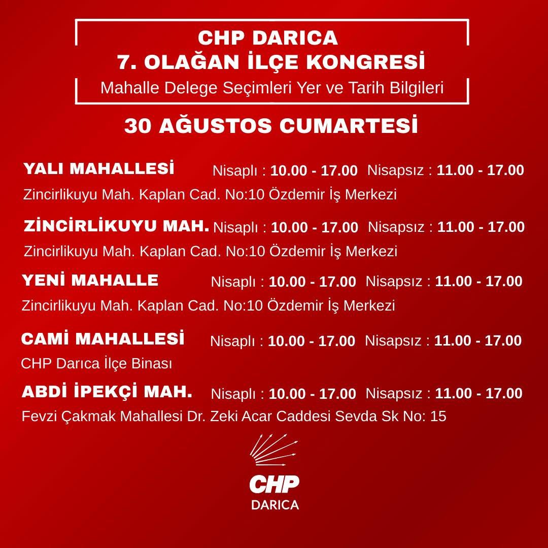 İlk hafta ilk iki mahallede Hüseyin Cihan Özaltan ikide iki yaparak üstünlük sağladığı, geride kalan hafta sonu dört mahallenin üçünde kazanan Tuncer Saltaş farkı kapattığı CHP Darıca İlçe Örgütü’nde kongreye doğru mahalle bazlı delege seçimleri 30 Ağustos Cumartesi günü Yalı, Zincirlikuyu, Yenimahalle, Cami ve Abdi İpekçi’de sürecek. 31 Ağustos Pazar günü ise Kazım Karabekir ve Fevzi Çakmak ile tamamlanacak. 14 mahalleli ilçede son kongre 6 Eylül Cumartesi veya 7 Eylül Pazar günü en çok delegeye sahip Bağlarbaşı Mahallesinde gerçekleşecek.