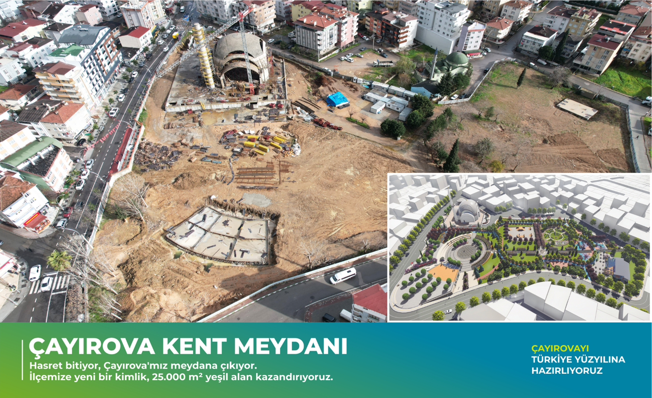 “Göreve geldiğimizde kent meydanının yeni projesini hazırladık. Kent meydanı yaptığımız yer altın değerinde bir alan. Burayı betona boğamazdık. Bir cami, bir kafeterya ve geri kalan yürüyüş yolu, bisiklet yolları, yeşil alandan oluşan bir proje oluşturduk. İnşaatımız devam ediyor. Camimizin kaba inşaatını bitirdik ama burada bir karar aldık. Madem elimizde böyle bir arazi var ve yapmışken doğrusunu yapalım, sıkışmış şehirlerdeki otopark sorununu ilerleyen yıllarda yaşamayalım diye, caminin alt katında bir katı 3 bin 400 metrekare olan üç katlı yeraltı otoparkı yaptık. Yeraltı üç kat otopark var kent meydanında. Bu sene tamamlanacak ve bittiği zaman, yer altı otoparkı, kafeteryası ve yeşil alanlarıyla halkımızın nefes alacağı 25 bin metrekare bir meydanı ilçemize kazandırmış olacağız.”