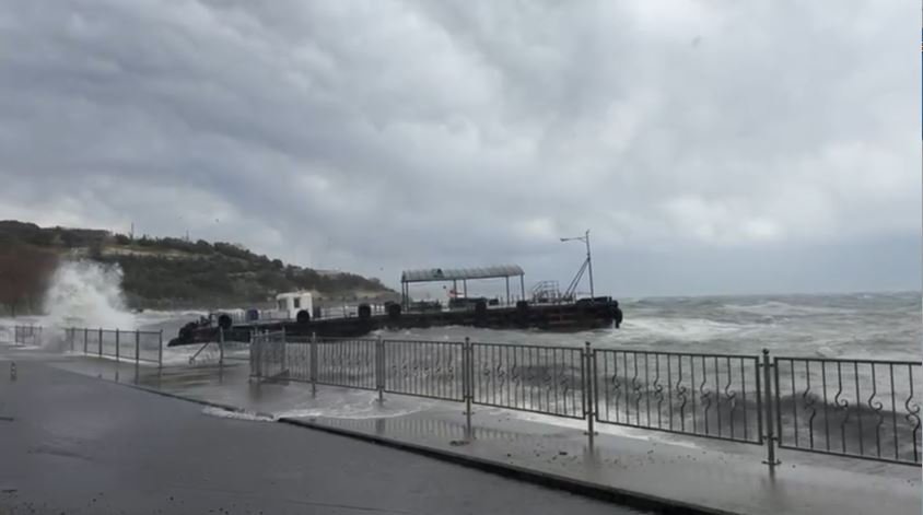 Darıca Yalı Mahallesi’nde pilot iskelesi olarak kullanılan eski feribot iskelesi halatların kopmasıyla sonucu denize sürüklendi. Fırtınanın etkisiyle iskele kıyı kesimine paralel bir şekilde yüzmeye devam ediyor. Şiddetli fırtına nedeniyle ekiplerin halatları kopan denize sürüklenen iskeleye müdahale de zorluklar yaşanıyor.