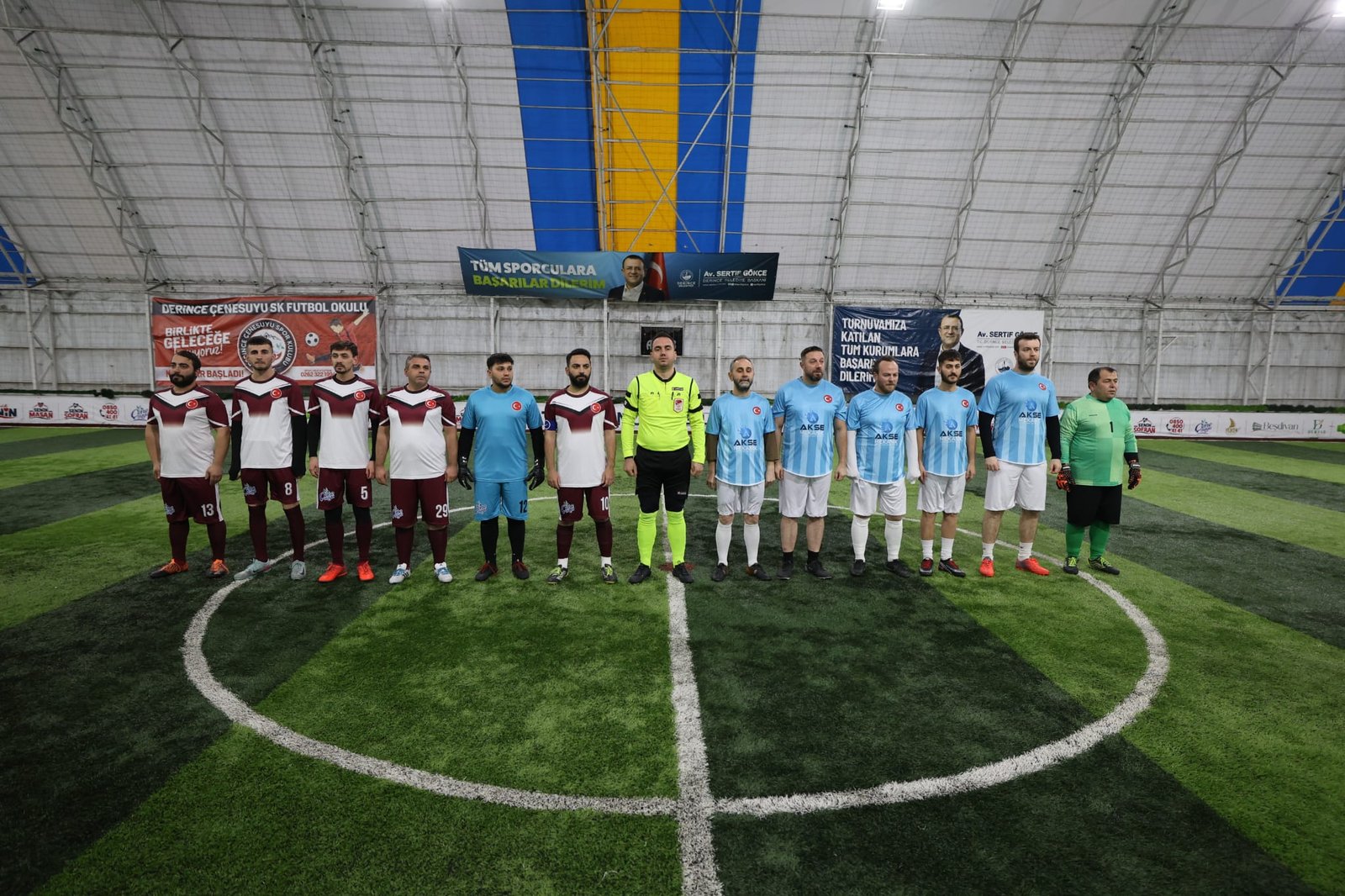 Derince Belediyesi’nin birimler arasındaki iletişim ve dayanışmayı artırmak amacıyla düzenlediği futbol turnuvasında heyecan başladı. Toplam 10 takımın iki ayrı grupta dostluk mücadelesine sahne olacak turnuva Derince Belediye Başkanı Av. Sertif Gökçe’nin başlama vuruşu ile start aldı. Yenikent Halı Saha Tesisleri’nde gerçekleşen açılış törenine belediye başkan yardımcıları, meclis üyeleri, muhtarlar, belediye daire müdürleri, sporcular ve spor severler katılım sağladı. Gruplarında ilk iki sırayı alan takımların yarı finale yükseleceği turnuvanın açılış müsabakasında Sosyal Destek Hizmetleri Müdürlüğü ile Fen işleri Müdürlüğü takımları karşı karşıya geldi.