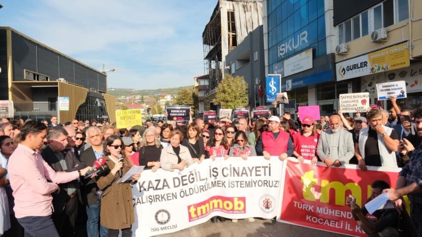 İşçi Sağlığı ve İş Güvenliği Meclisi (İSİG), TMMOB Kocaeli İl Koordinasyon Kurulu ve TTB Kocaeli Tabip Odası, Dilovası’nda 3’ü çocuk 6 işçinin hayatını kaybettiği iş yeri önünde basın açıklaması yaptı. Açıklamayı Avukat Elif Yetigin okudu.
