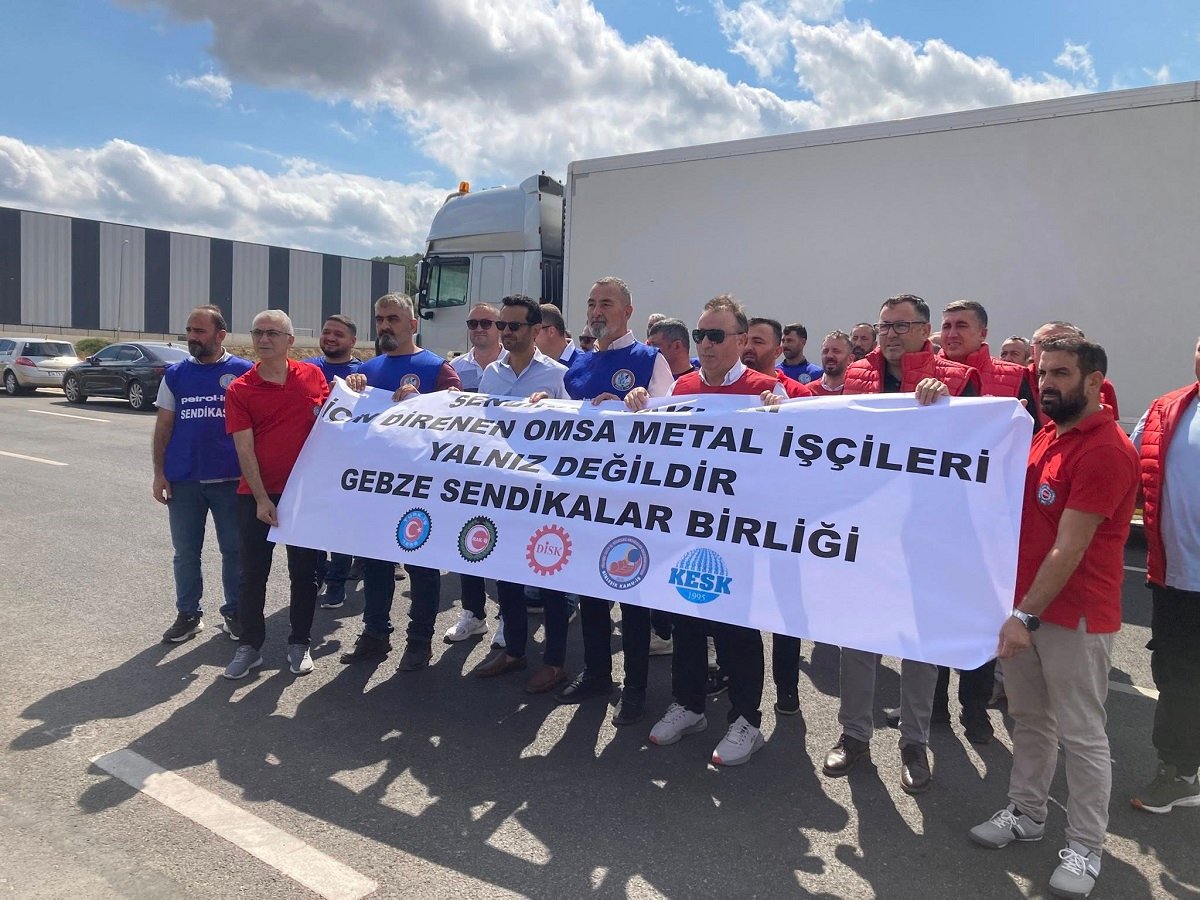 DİSK/Birleşik Metal-İş Sendikasının örgütlendiği ve toplu iş sözleşmesi görüşmelerinin devam ettiği OMSA Metal’de hiçbir haklarını almadan işten çıkarıldıkları için işyeri önünde 43 gündür direnişte bulunan işçilere Gebze Sendikalar Birliği’nden destek geldi. Birlik üyesi sendika şube başkan ve temsilcileri pankartlar ve sloganlarla işyeri önünde işçilere destek verdiler, yalnız olmadıklarını ifade ederek haklarını geri alana kadar yanlarında olacaklarını söylediler.