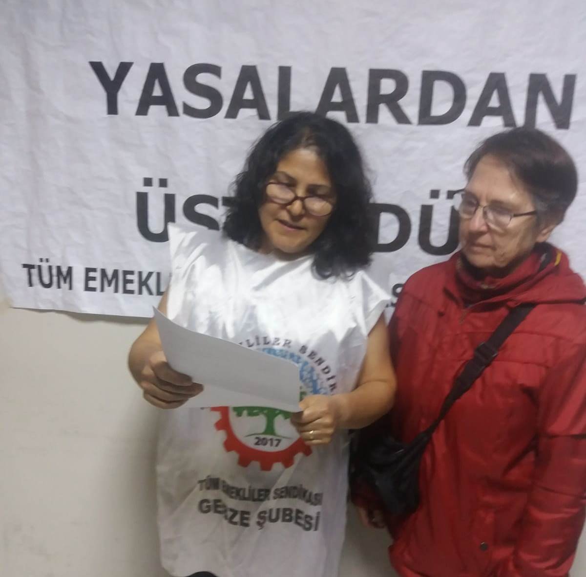 Sendikasına sahip çıkan Gebzeli emekliler, Cemil Yüksek başkanlığındaki Tüm Emeklilerin Sendikası Gebze Şubesi’ndeki açıklamada “Bu ayıp iktidarındır. Dava açılacaksa adres bellidir” dedi. Sendika üyesi Meral Uzunkaya tarafından okunan açıklamada şu görüşlere yer verildi: