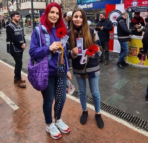 Kocaeli İl Emniyet Müdürlüğü 8 Mart Dünya Kadınlar Günü kapsamında kadınların günlerini kutladı. Kadına Yönelik Şiddetle Mücadelede tüm vatandaşların konu hakkında bilinçlenmesi ve bu hususta hassasiyet oluşturulması ayrıca KADES (Kadın Acil Destek) Uygulamasının yaygınlaştırılması amacıyla; İzmit Yürüyüş Yolu üzeri Belediye İş Hanı önünde stant açan Emniyet Müdürlüğü kadın polsileri “Kadına El Kalkamaz” ve “KADES” ibareli broşür dağıttılar. Kadın polisler ayrıca kadın vatandaşların telefonlarına KADES Uygulamasının yükletilmesini sağladılar ve çiçek verdiler.
