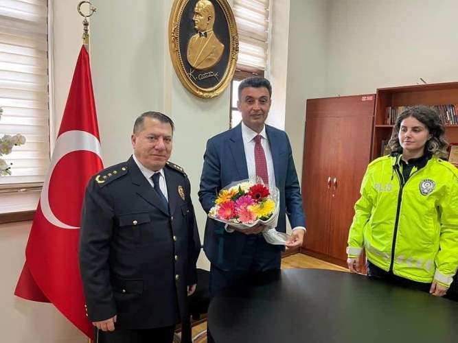 Emniyet Teşkilatının 178. kuruluş yıldönümü kutlama haftası kapsamında, İlçe Emniyet Müdürü Ahmet Zihnî Manap,emniyet mensubu polis ve bekçi memurlarından oluşan bir heyet Darıca Kaymakamı Yüksel Kara’yı makamında ziyaret ettiler. Kaymakam Kara, Emniyet Müdürü Ahmet Zihni Manap ve beraberindeki memurlara ziyaretlerinden duyduğu memnuniyeti dile getirerek; ‘’Türk Polis Teşkilatı’nın 178. kuruluş yıldönümünü kutluyorum. Milletimize hizmet yolunda büyük bir özveri ve fedakarlık içinde çalışan polis ve bekçilerimize teşekkür ediyor, işlerinde kolaylıklar diliyorum.’’ Dedi.