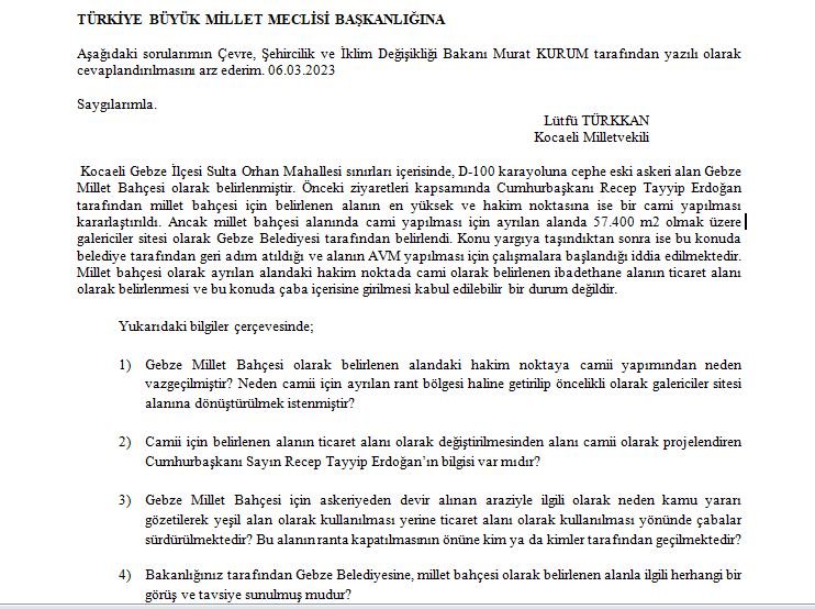 Konuyla ilgili Türkkan; Gebze Millet Bahçesi için askeriyeden devir alınan araziyle ilgili olarak neden kamu yararı gözetilerek yeşil alan olarak kullanılması yerine ticaret alanı olarak kullanılması yönünde çabalar sürdürülmektedir? Bu alanın ranta kapatılmasının önüne kim ya da kimler tarafından geçilmektedir? Dedi. Oldu bittiye getirilmek istenen alanla ilgili Türkkan; “Bakanlığınız tarafından Gebze Belediyesine, Millet Bahçesi olarak belirlenen alanla ilgili herhangi bir görüş ve tavsiye sunulmuş mudur?” diyerek Bakanlığın konudan haberdar olup olmadığını sordu.
