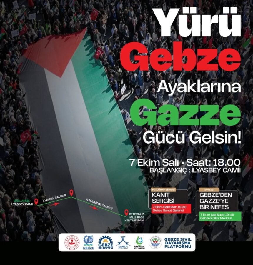 7 Ekim Salı günü (bugün) saat 18.00’de İlyasbey Camii önünden başlayacak yürüyüşün ardından, Gazze Sanat Galerisi’nde “Kanıt Sergisi” ile Gebze Kültür Merkezi’nde “Gebze’den Gazze’ye Bir Nefes” söyleşisi yer alacak.