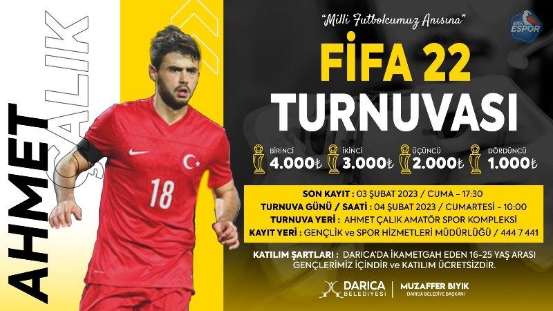 Darıca’da ikamet eden, 16-25 yaş arasındaki tüm gençlerin davet edildiği Ahmet Çalık Fifa 22 Turnuvası kayıtları başladı. Gençlik ve Spor Hizmetleri Müdürlüğünde kayıtların yapıldığı turnuva 4 Şubat 2023 Cumartesi günü saat 10:00’da başlayacak. Ahmet Çalık Amatör Spor Kompleksinde gerçekleştirilecek turnuvada birinci gelen takıma 4 bin, ikinci gelen takıma 3 bin, üçüncüye 2 bin ve dördüncüye de bin TL para ödülü verilecek.  Katılımın ücretsiz olduğu turnuvada kayıtlar 3 Şubat Cuma günü saat 17:30 da sona erecek.