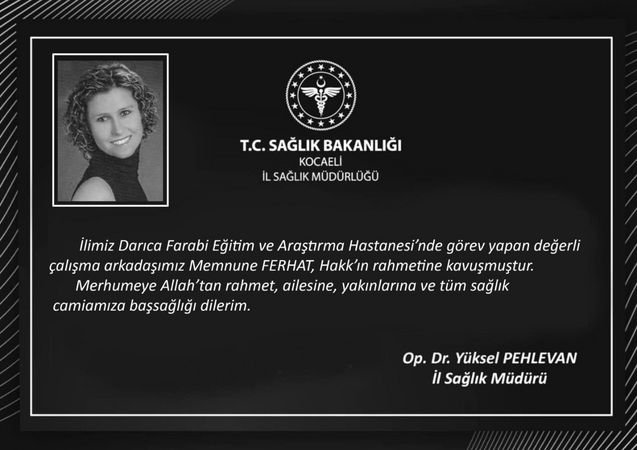 Darıca Farabi Eğitim ve Araştırma Hastanesi’nde görev yapan Memnune Ferhat, yakalandığı amansız hastalığı sebebiyle vefat etti. Ölümüyle sevenlerini yasa boğan Ferhat’ın ardından İl Sağlık Müdürü Op. Dr. Yüksel Pehlevan taziye mesajı yayınladı.
