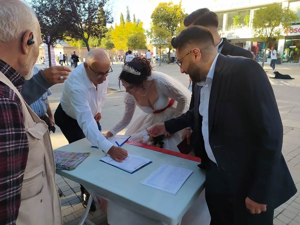 Gebzeli emeklilerin, maaşlarına yapılan yüzde 25’lik artışı protesto etmek için Gebze Kent Meydanı’nda başlattıkları imza kampanyasına yeni evlenen bir çift destek verdi. Emekli maaşına yapılan yüzde 25 oranındaki artışı protesto etmek için Ankara’ya yürümek isteyen emekliler, izin alamayınca Gebze Kent Meydanı’ndaki Çamlık Parkı’nda 23 Temmuz Pazar günü oturma eylemine başlamıştı. Oturma eyleminde 2. ay yaklaşırken imza kampanyasına yeni evlenen bir çift destek oldu. İmza atmak için emeklilere destek vermeye gelen gelin ve damat coşkuyla karşılandı. Renkli görüntülere sahne olan gelin ve damadın imzasına emekliler teşekkür etti.