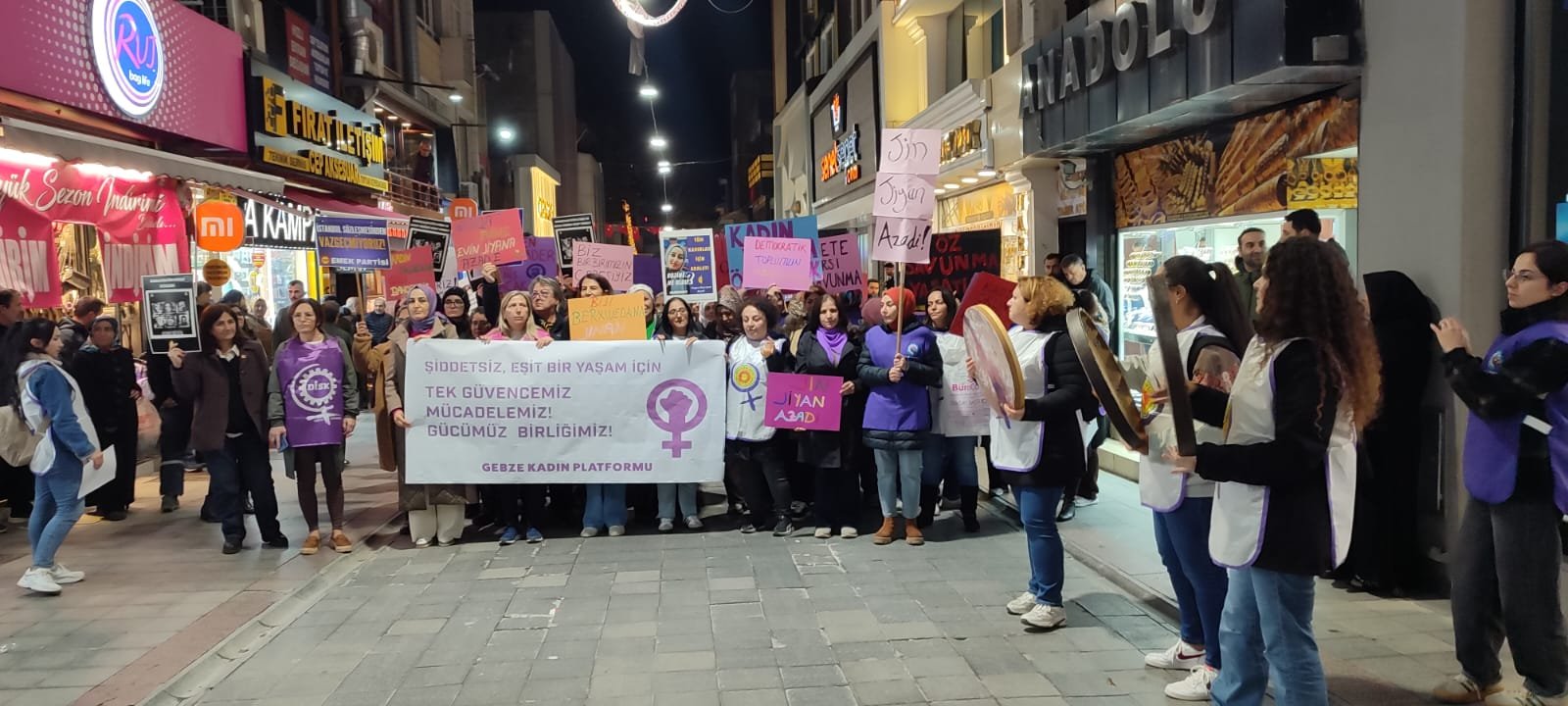 Gebze Kadın Platformu 25 Kasım Kadına Yönelik Şiddete Karşı Uluslararası Mücadele Günü’nde, yürüyüş düzenledi. Platform üyesi sivil toplum kuruluşları ve siyasi partilerin temsilcilerinden oluşan kalabalık kadın topluluğu Eskiçarşı, Hükümet Caddesi üzerinde taksi durağı ile AKP Gebze İlçe Teşkilat binası önünde toplandı. Kadınlar buradan sloganlar eşliğinde 15 Temmuz Milli İrade Kent Meydanı’na, ellerinde kadın cinayetlerini sorgulayan, 2025’in “Aile yılı” ilanını ret eden içerikli dövizlerle, ebane tınısı eşliğinde, “ses çıkartarak” ve renkli görüntülerle yürüdü. “Şiddetsiz Eşit Bir Yaşam İçin”, “Tek Güvencemiz Mücadelemiz”, “Gücümüz Birliğimiz” sloganlarıyla yürüyen kadınlar, Türkiye genelinde artan şiddet vakalarına ve kadın emeğinin görünmez kılınmasına dikkat çekti.