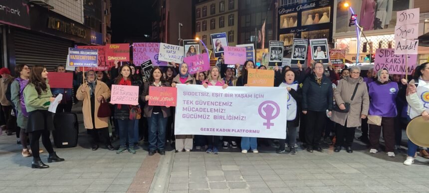 Gebze Kadın Platformu 25 Kasım Kadına Yönelik Şiddete Karşı Uluslararası Mücadele Günü’nde, yürüyüş düzenledi. Platform üyesi sivil toplum kuruluşları ve siyasi partilerin temsilcilerinden oluşan kalabalık kadın topluluğu Eskiçarşı, Hükümet Caddesi üzerinde taksi durağı ile AKP Gebze İlçe Teşkilat binası önünde toplandı. Kadınlar buradan sloganlar eşliğinde 15 Temmuz Milli İrade Kent Meydanı’na, ellerinde kadın cinayetlerini sorgulayan, 2025’in “Aile yılı” ilanını ret eden içerikli dövizlerle, ebane tınısı eşliğinde, “ses çıkartarak” ve renkli görüntülerle yürüdü. “Şiddetsiz Eşit Bir Yaşam İçin”, “Tek Güvencemiz Mücadelemiz”, “Gücümüz Birliğimiz” sloganlarıyla yürüyen kadınlar, Türkiye genelinde artan şiddet vakalarına ve kadın emeğinin görünmez kılınmasına dikkat çekti.