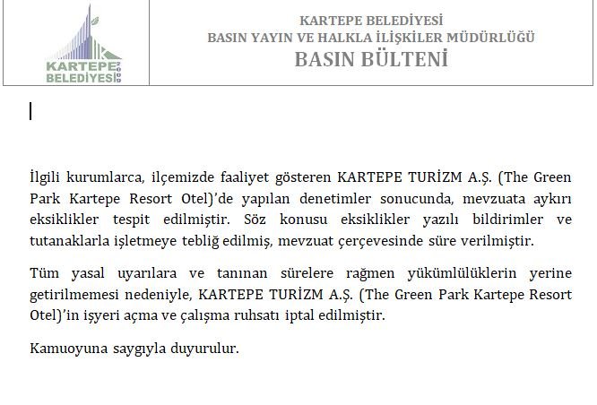 Tüm yasal uyarılara ve tanınan sürelere rağmen yükümlülüklerin yerine getirilmemesi nedeniyle, KARTEPE TURİZM A.Ş. (The Green Park Kartepe Resort Otel)’in işyeri açma ve çalışma ruhsatı iptal edilmiştir.’’ denildi.