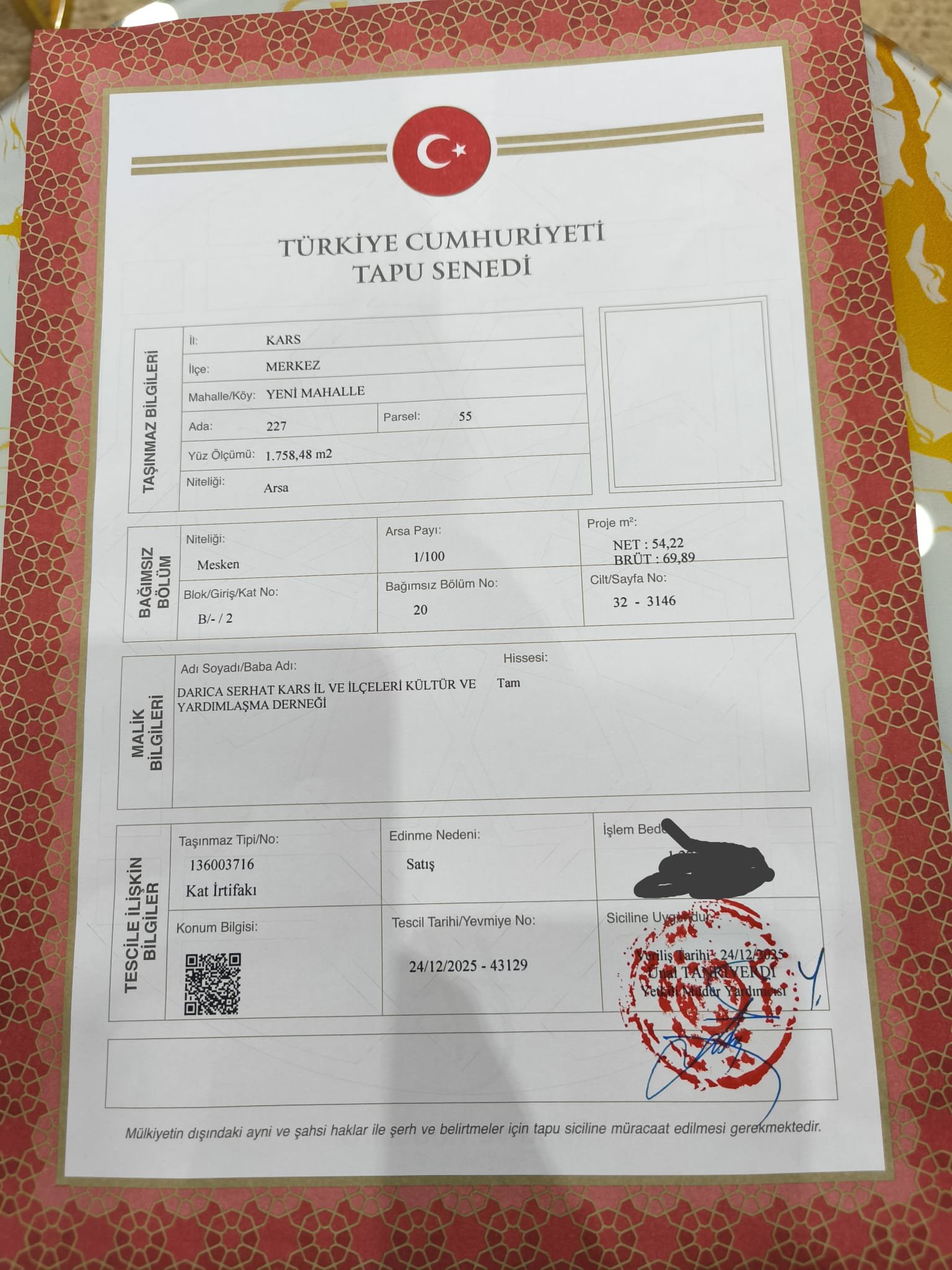 Darıca Serhat Kars İli ve İlçeleri Kültür ve Yardımlaşma Derneği’nin artık tapulu bir yeri var.
