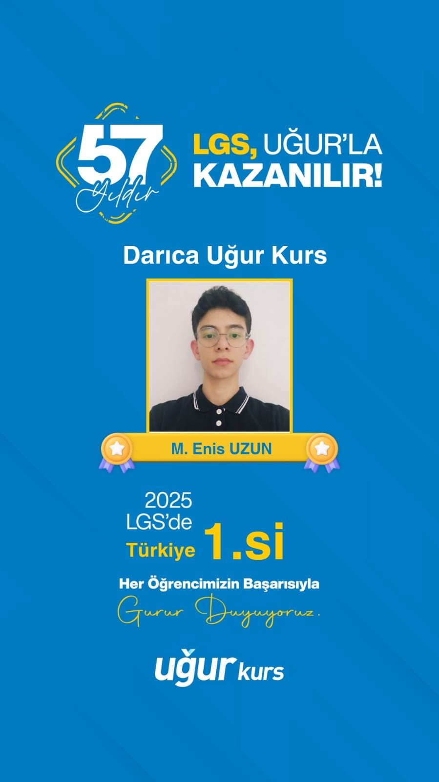 Darıca Uğur Kurs Merkezi birincilik elde eden öğrencilerin ailelerinin ve kendilerinin gururu olduğunu ifade ederek M. Enis Uzun’u tebrik etti.