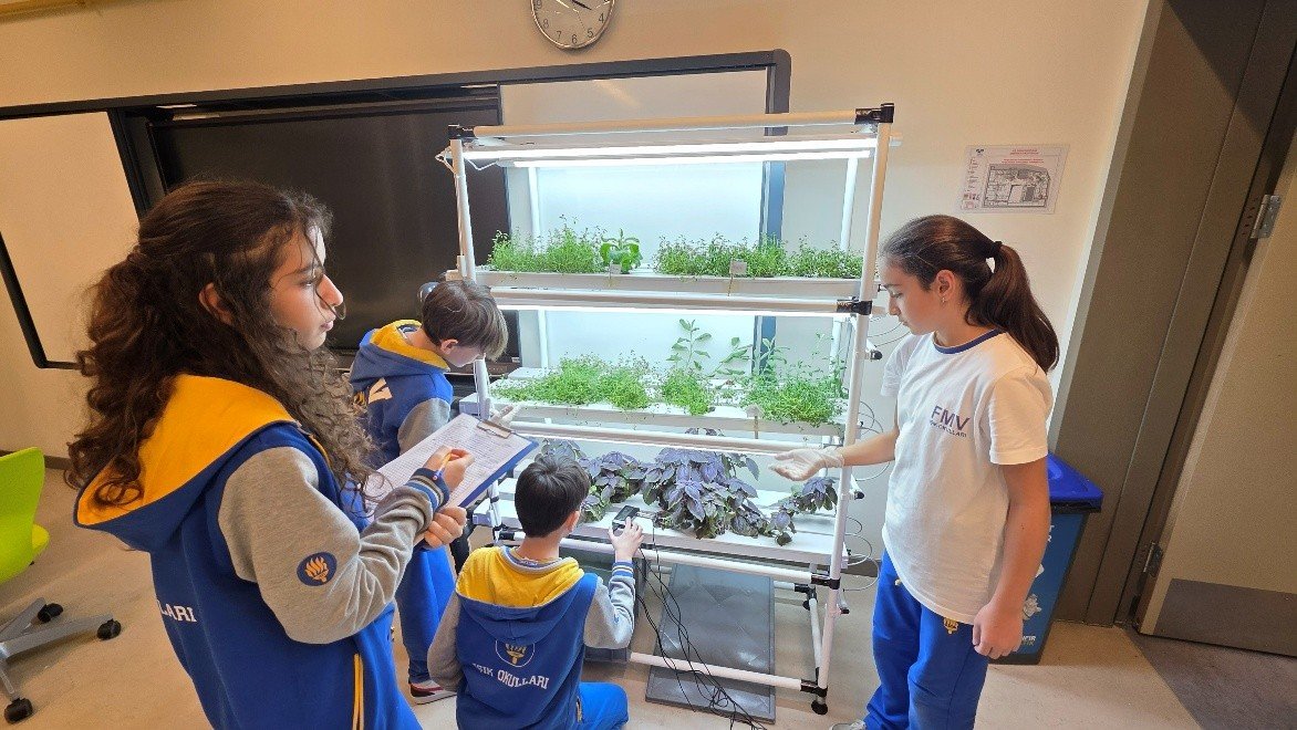 Okulun fen bilimleri laboratuvarında kurulan hidroponik sistem, klasik tarım yöntemlerinden farklı olarak bitkilerin toprak yerine besin açısından zengin su içinde yetişmesini sağlıyor. Katlı ve dikey olarak tasarlanan sistem sayesinde sınırlı bir alanda çok sayıda bitki yetiştirilebiliyor.