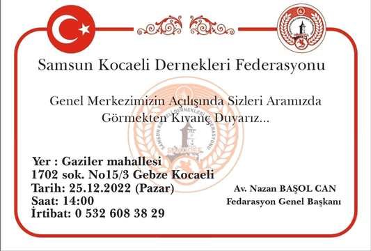 Federasyon Başkanı Av. Nazan Başol Can, Genel Merkez açılışının 25 Aralık Pazar günü saat 14:00’te Gebze Gaziler Mahallesi 1702 Sok No 15/3 adresinde gerçekleştirileceğini duyurdu.