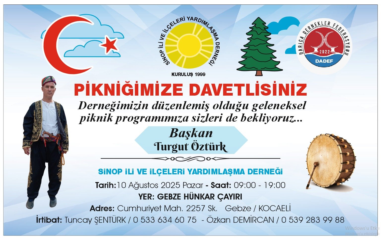 Sinop İli ve İlçeleri Yardımlaşma Derneği hemşehrilerini geleneksel piknikte buluşturuyor. Dernek başkanı Turgut Öztürk; Böylesi güzel buluşmalar, sadece kültürümüzü yaşatmakla kalmıyor, aynı zamanda birlik ve beraberliğimiz daim ediyor. Birlik ve beraberliği pekiştirecek olan geleneksel pikniğimize tüm hemşehrilerimiz davetlidir.’’ Çağrısında bulundu.