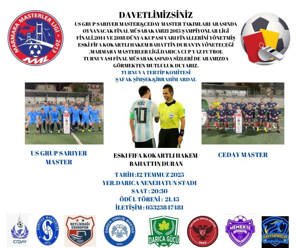 Us Grup Sarıyer master ile Ceday master takımları arasında oynanacak Final müsabakasını 2015 Şampiyonlar Ligi finali, 2014 ve 2018 Dünya kupası yarı finalleri yönetmiş Eski FİFA Kokartlı Hakem Bahattin Duran yönetecek. Palmiye inşaat &Emlak firması sponsorluğunda, 12 Temmuz tarihinde, Darıca Nenehatun stadında oynanacak maç saat 20.30’da başlayacak. Turnuvanın ev sahibi Şafak Şimşek, final müsabakasına sponsor olan Palmiye inşaat ve emlak firması teşekkür ederek, “Final maçını Ulusal ve Uluslararası düzeyde müsabakalarda görev yapmış üst hakem tarafından yönetilecek olması bizim için bir gurur ve aynı zamanda tatlı bir heyecandır “dedi. Tüm Darıca ve çevre ilçelerde oturan sporseverleri maça davet eden Şafak Şimşek, katılım sağlayan tüm takımlara teşekkür plaketini ödül töreninde takdim edeceğini söyledi.